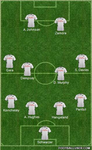 Schwarzer · Hangeland · Hughes · Riise · Riether · Diarra · Sidwell · Dejagah · Duff · Ruiz · Berbatov