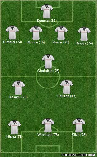 13. Дэвид Стокдэйл · 5.Бреде Хангеланд · 4.Джон Хейтинга · 35.Фернандо Аморебьета · 9.Маамаду Диарра · 28.Скотт Паркер · 15.Киран Ричардсон · 24.Ашкан Дежага · 7.Стив Сидвелл · 10.Льюис Холтби · 20.Уго Родальега