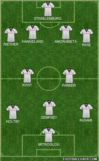 Stekelenburg · Heitinga · Hangeland · Riether · Amorebieta · Parker · Sidwell · Dejagah · Richardson · Holtby · Rodallega