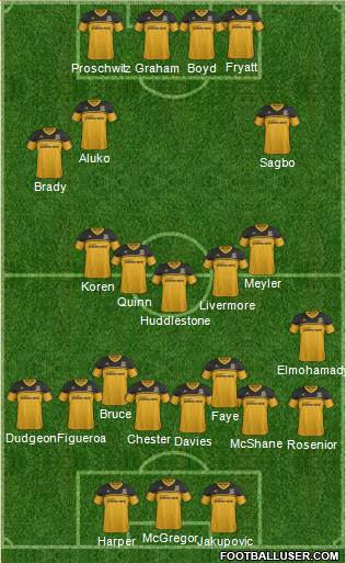 Harper · Jakupovic · McGregor · Rosenior · McShane · Davies · Chester · Dudgeon · Figueroa · Faye · Bruce · Elmohamady · Huddlestone · Livermore · Quinn · Koren · Meyler · Brady · Sagbo · Aluko · Proschwitz · Graham · Boyd · Fryatt