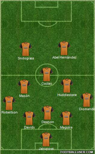 Hernandez · Clucas · Markovic · Meyler · Evandro · Huddlestone · Elabdellaoui · Robertson · Dawson · Maguire · Jakupovic