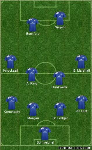 Schmeichel · Moore · Miquel · Morgan · Konchesky · James · Drinkwater · Dyer · De Laet · Knockaert · Vardy
