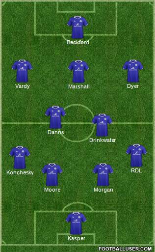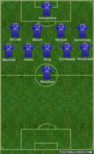 1. Каспер Шмейхель · 3. Кончески · 6. Уитбред · 2. Де Лат · 5. Морган · 10. Кинг · 4. Дринкуотер · 24. Кноккарт · 11. Дайер · 35. Дэвид Ньюджент · 9. Джейми Варди