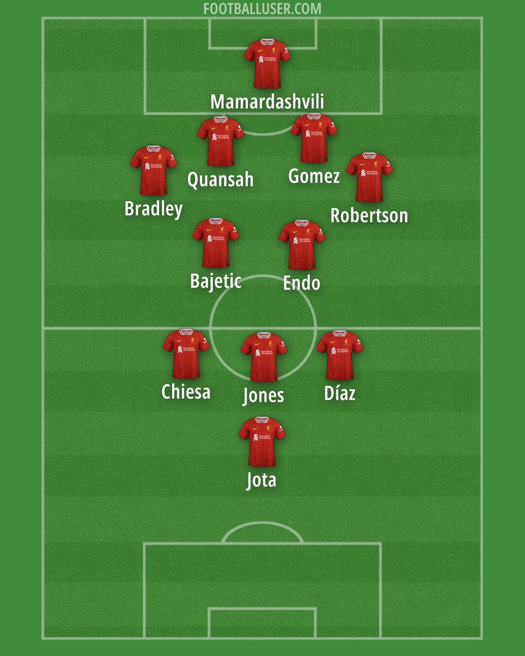 Isak (Ekitike) · Szoboszlai (Chiesa) · Semenyo (Salah) · Wirtz (Gakpo) · Mac Allister · Gravenberch · Guehi · Van Dijk (C) · Bradley · Kerkez · A. Becker
