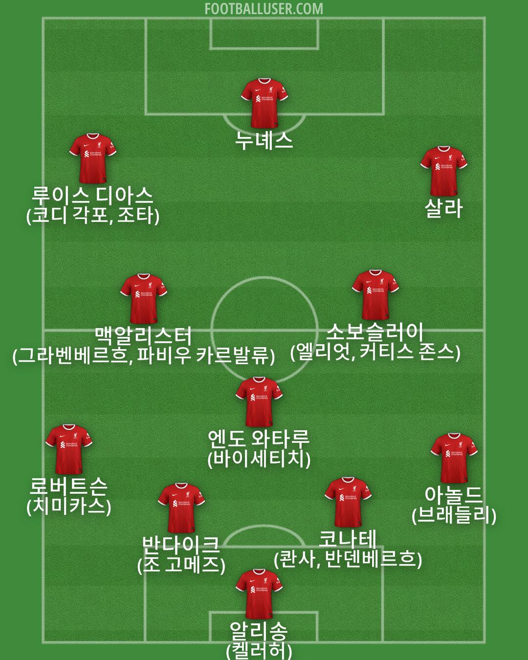 Wirtz · L. Díaz · Salah · Gravenberch · Mac Allister · Szoboszlai · Robertson · Frimpong · van Dijk · Konaté · Alisson