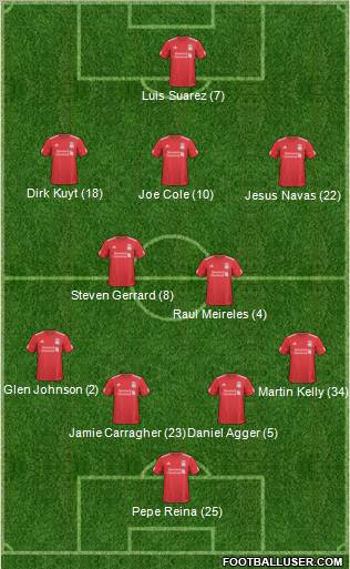 Рейна · Кириякос · Шкртел · Каррагер · Уилсон · Лукас · Спиринг · Мейрелеш · Кяут · Суарес · Кэрролл