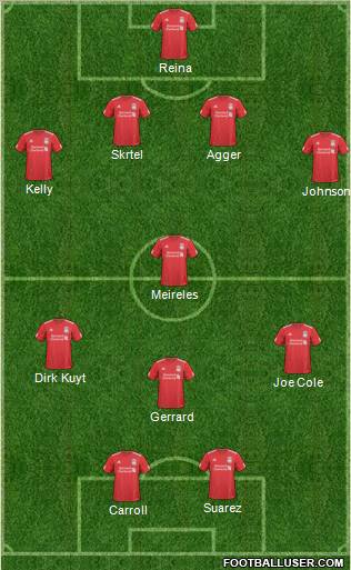Suarez · Carroll · Meireles · Kuyt · Gerrard · Lucas · Kelly · Johnson · Agger · Skertel · Reina