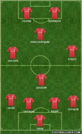 Reina · J. Carragher · D. Agger · M. Kelly · L. Baines · Lucas · R. Meireles · S. Gerrard · A. Young · L. Suarez · A. Carroll