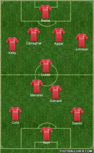 Reina · Agger · Carrager · G. Johnson · Kelly · Gerrard · Meireles · Maxi · Kuyt · Carroll · Suarez