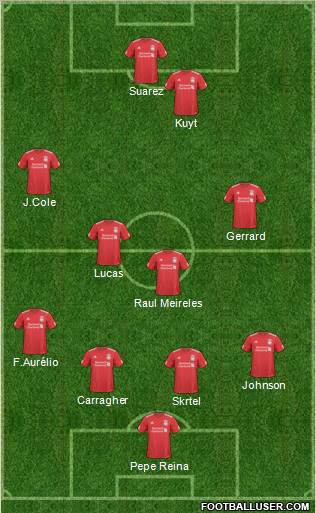 Pepe Reina (25) · D. Wilson (22) · D. Agger (5) · M. Kelly (34) · G. Johnson (2) · C. Adam (26) · Raúl Meireles (4) · S. Gerrard (8) · J. Cole (10) · L. Suárez (7) · A. Carroll (9)