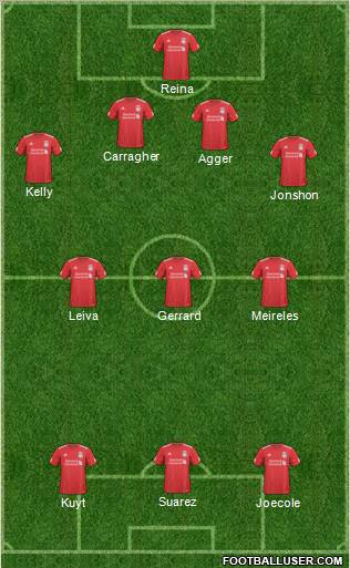 Reina · Carragher · Agger · Johnson · Kelly · Lucas · Gerrard · Meireles · Kuyt · Suarez · carroll