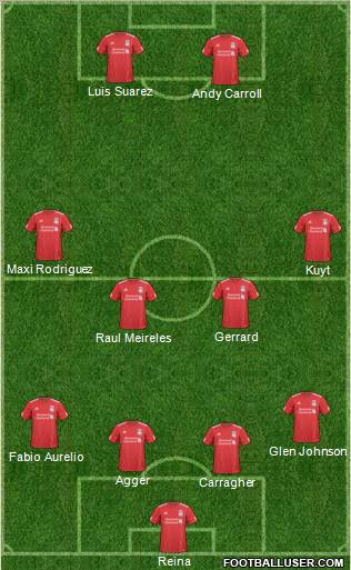 Pepe Reina · Daniel Agger · Martin Skrtel · Glen Johnson · Martin Kelly · Lucas · Steven Gerrard · Raul Meireles · Luis Suarez · Andy Carroll · Dirk Kuyt
