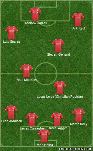 Reina · Skrtel · Agger · Kelly · Johnson · Lucas · Gerrard · Meireles · Kuyt · Suarez · Carroll