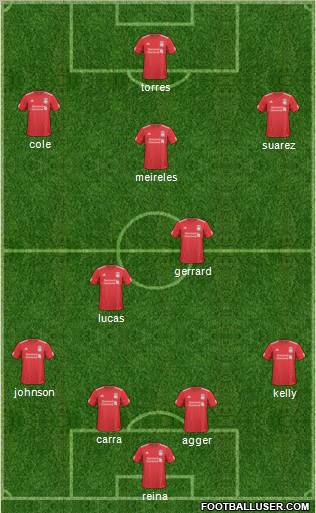 Reina · Carragher · Agger · Johnson · Kelly · Gerrard · Meireles · Kuyt · Rodriguez · Caroll · Suarez