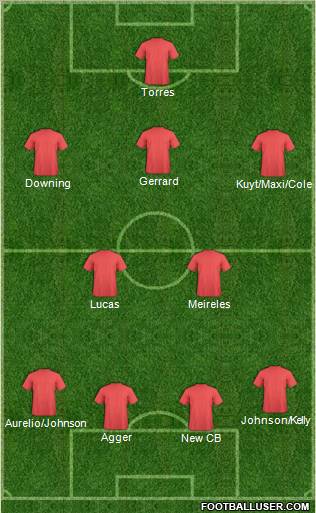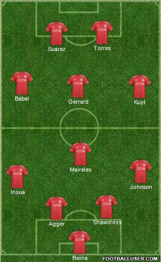 Pepe Reina · Martin Skrtel · Jamie Carragher · Daniel Agger · Fabio Auriello · Lucas · Raul Merieles · Luis Saurez · Steven Gerrard · Dirk Kuyt · Andy Carroll
