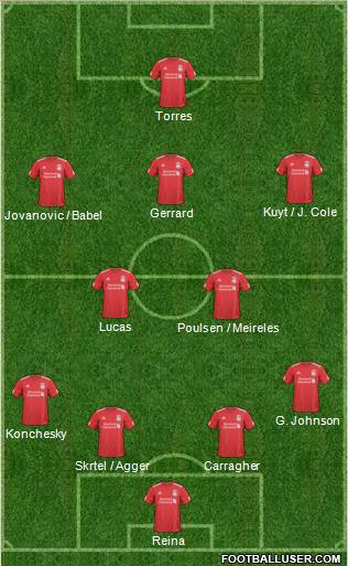 reina · skrtel · g.johnson · carragher · agger · gerrard · j.cole · maxi · kuyt · caroll · suarez
