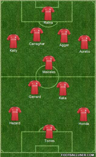 J. Reina · J. Carragher · D. Agger · F. Coentrao · G. Johnson · R. Meireles · S. Gerrard · J. Cole · P. Hernández · L. Suárez · A. Caroll