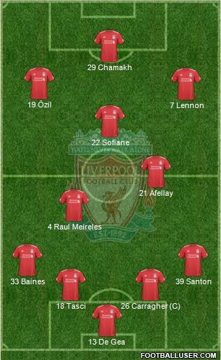 Reina · Agger · Carragher · Kelly · Johnson · Lucas · Gerrard · Meierales · Maxi · Kuyt · Suarez