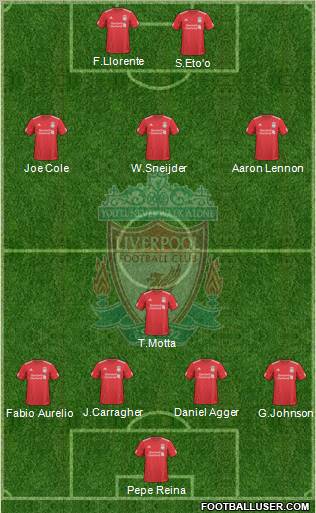 Reina · Agger · Kjaer · F.Aurélio · Jonhson · F.Melo · Gerrard · Meireles · Kuyt · Suarez · Lisandro