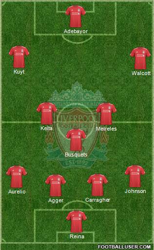 25.레이나 · 3.코네체스키 · 23.캐러거 · 5.아거 · 2.존슨 · 4.메이렐레스 · 8.제라드 · 17.로드리게즈 · 18.쿠잇 · 9.캐롤 · 7.수아레즈