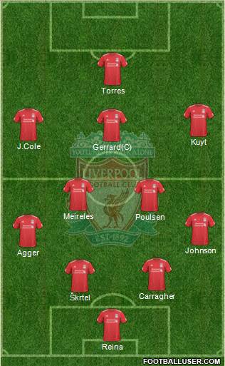 Reina · Agger · Carragher · F. Aurelio · Johnson · Poulsen · Meireles · Gerrard · Maxi · Carroll · Suarez