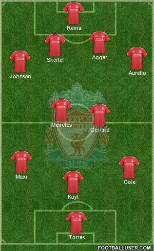 P.Reina · M.Skrtel · M.Kelly · D.Ager · G.Jonshon · S.Gerard · Lucas · R.Meireles · A.Yong · L.Suarez · E.Cavani