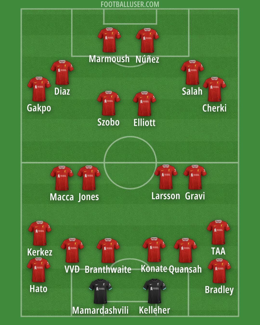 Frimpong (Bradley) · Konate (Leoni) · Alisson (Mama) · VVD (Gomez) · Kerkez (Robertson) · Gravenberch (Endo) · Macca (Jones) · Wirtz (Szobo) · Gakpo (Chiesa / Ngumoha) · Ekitike (Chiesa / Danns) · Salah (Chiesa / Frimpong)