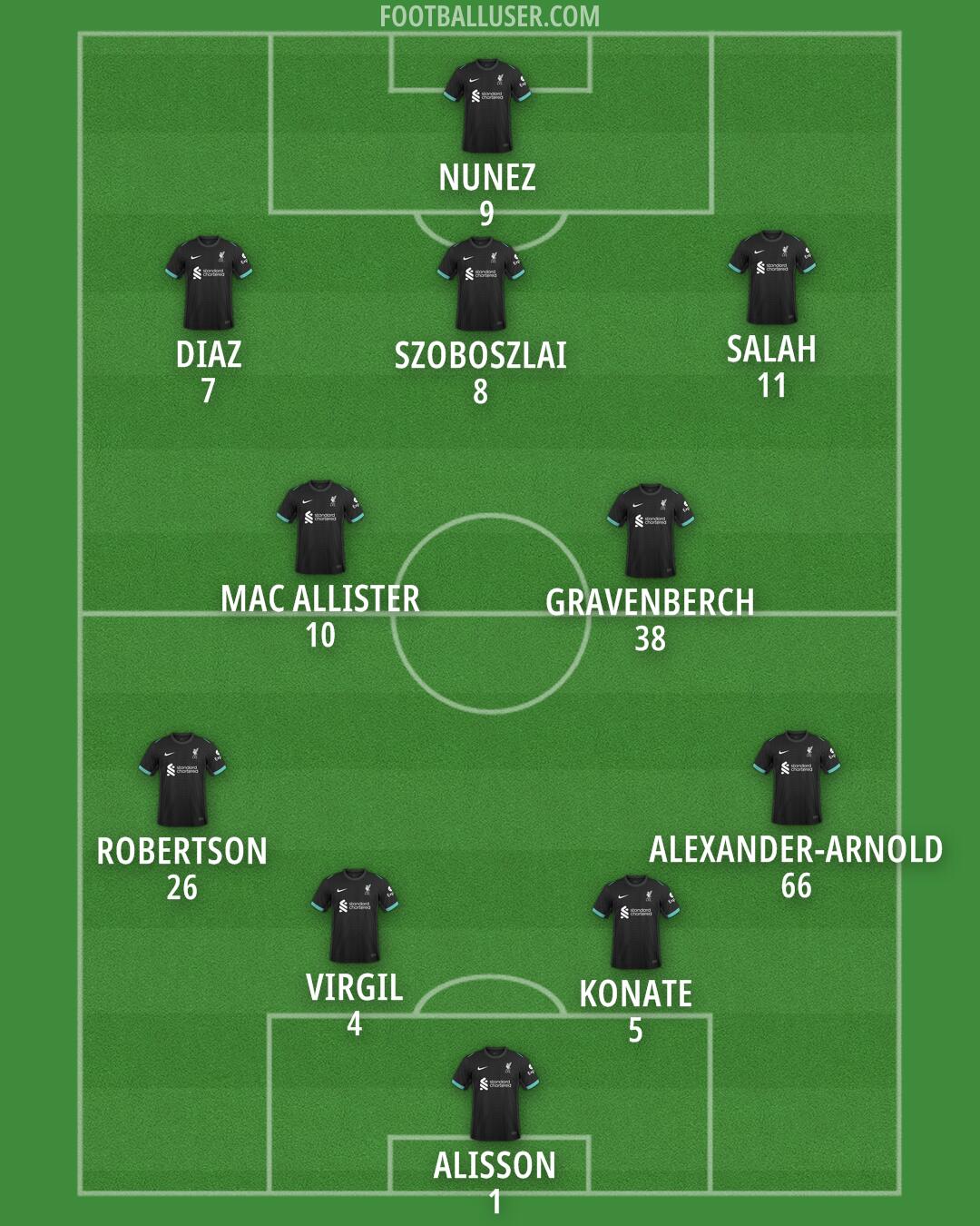 Wirtz · Chiesa · Salah · Mac Allister · Szoboszlai · Gravenberch · Kerkez · Frimpong · van Dijk · Konaté · Alisson