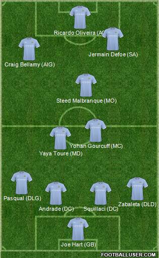 Joe Hart · Kolo Touré · V. Kompany · A. Kolarov · P. Zabaleta · Lass Diarra · A. Johnson · David Silva · Yaya Touré · Edin Džeko · Carlos Tévez