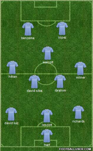 Hart · Kompany / Lescott · K. Toure · Kolarov / Boateng · Richards / Zabaleta · Barry · De Jong · Yaya Toure · Silva / Balotelli · Milner / A. Johnson · Tevez