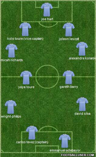 Hart · Boateng · Touré · Zabaleta · Lescott · Barry · Touré · Jhonson · Balotelli · Tevez · Dzeko