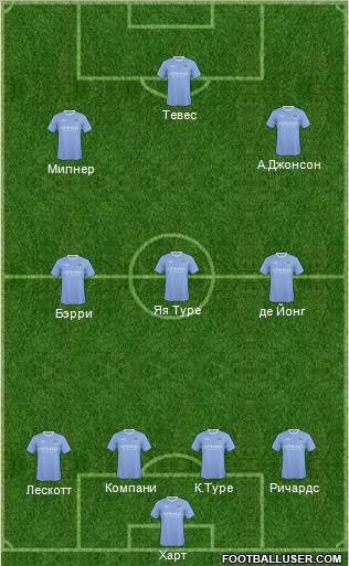 Hart 82 · Lescoot 81 · Touré 84 · Zabaleta 78 · Kolarov 79 · Touré 83 · Barry 82 · Silva 85 · Johnson 81 · W-Phillips 80 · Tevez 86
