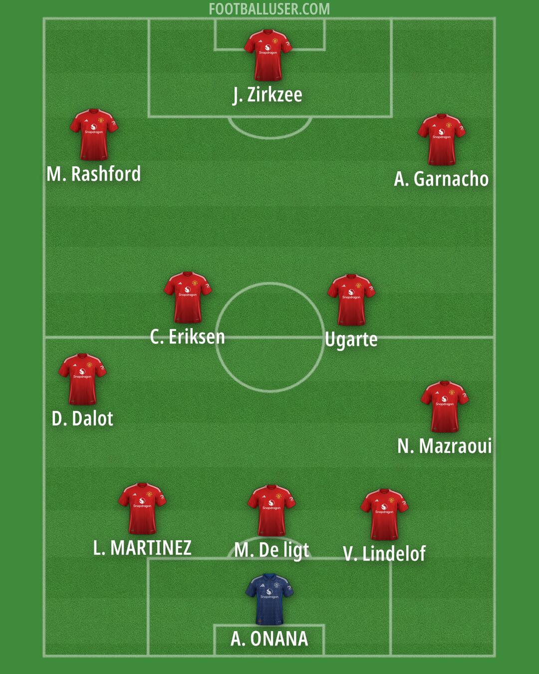 Hojlund (Zirkzee) · Cunha (Mainoo) · Rashford (Mount) · Amad (Dalot) · Dorgu (Malacia) · Bruno (Collyer) · Ugarte (Casemiro) · Yoro (Mazraoui) · De Ligt (Maguire) · Shaw (Heaven) · Onana (Bayindir)