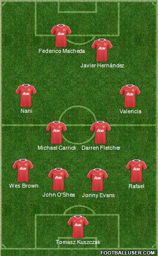 Van Der Saar · Evans · Ferdinand · Evra · Brown · Carrick · Fletcher · Giggs · Nani · Hernández · Rooney