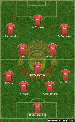 1. Adler · 3. Fabio · 5. Smalling · 4. Suboitic · 2. Rafael · 6. Rodwell · 8. Henderson · 10. Cleverly · 11. Bale · 7. Morrison · 9. Macheda