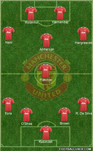 Van Der Sar · Rafael · Evra · Vidic · Ferdinand · Scholes · Nani · Giggs · Rooney · Bervatov · Chicharito
