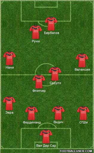10.Rooney · 9.Berbatov · 17.Nani · 25.Valencia · 16.Carrick · 24.Fletcher · 3.Evra · 22.O'Shea · 5.R.Ferdinand · 15.Vidic · 1.Van der Sar