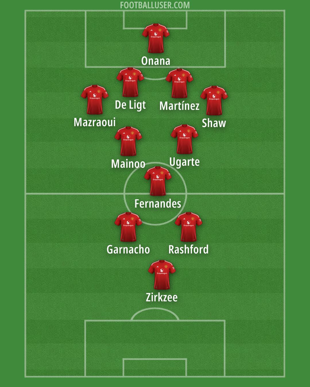 1.JOAN GARCIA* (24.Onana/22.Heaton) · 9.OSIMHEN* (11.Zirkzee) · 10.CUNHA* (7.Mount) · 19.MBEUMO* (16.Amad/17.Garnacho) · 14.EDERSON* (25.Ugarte) · 8.WHARTON* (18.Mainoo) · 13.DORGU (23.Leon/30.Amass) · 21.NEW RWB* (2.Dalot) · 6.MARTINEZ (26.Heaven/23.Shaw) · 12.NEW RCB* (3.Mazraoui) · 4.DE LIGT (5.Maguire)
