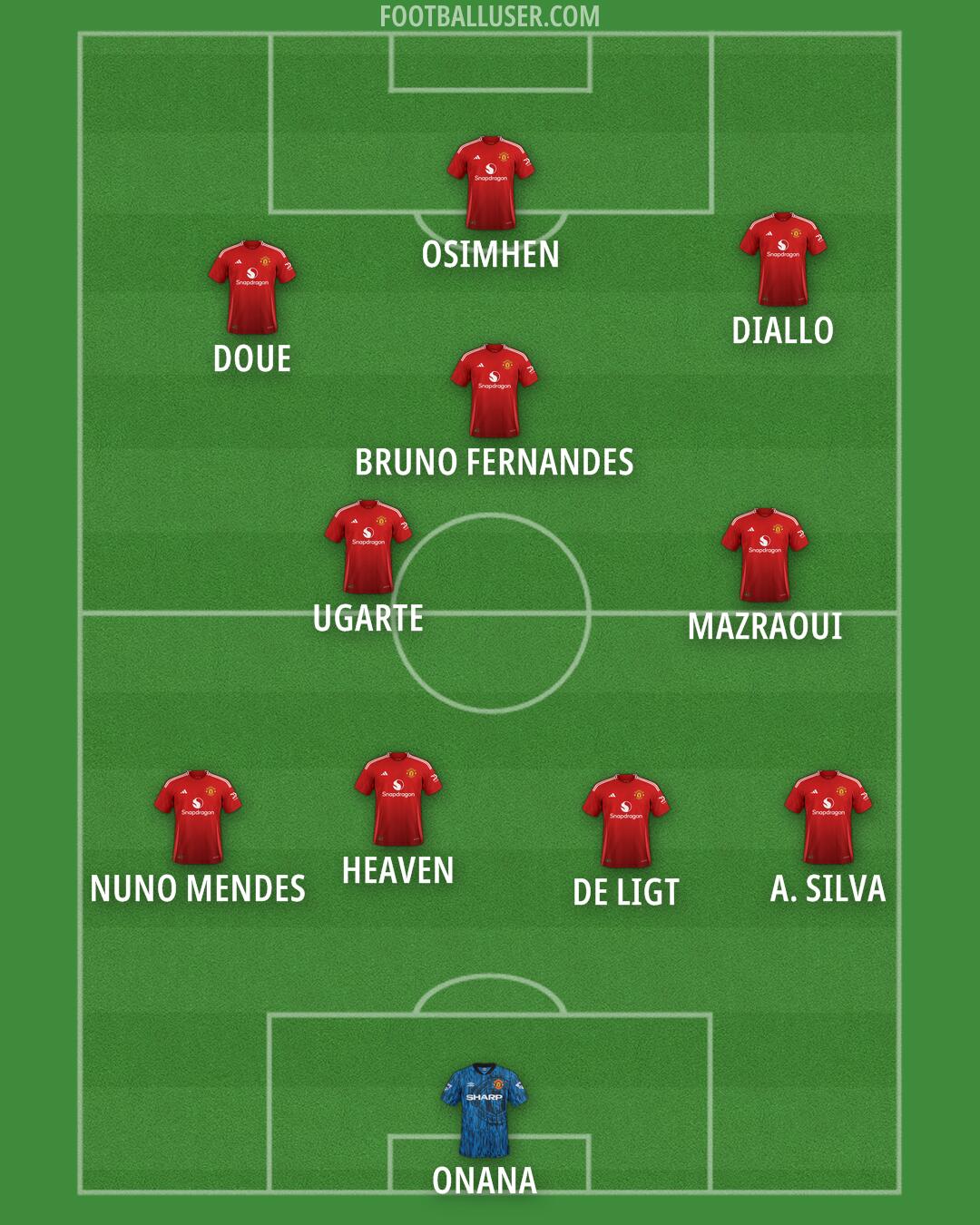 Bruno Fernandes · Dorgu · Amad · Sesko · Matheus Cunha · Casemiro · Mainoo · Yoro · Shaw · Maguire · Bayindir