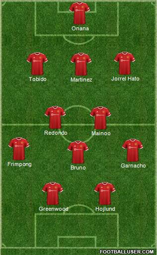 11. (Zirkzee) · 12.Diallo · 17.Garnacho · 8.Fernandes · 25.Ugarte · 3.Mazrauoi · 20.Dalot · 4 .De ligt · 5.Maguire · 18.Casemiro · 24.Onana