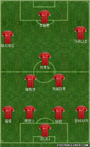 데헤아 (GK) · 데니스 어윈 (LB) · 네마냐 비디치 (CB) · 리오 퍼디난드 (CB) · 게리 네빌 (RB) · 라이언 긱스 (LM) · 폴 스콜스 (CM) · 바비 찰튼 (CM) · 크리스티아누 호날두 (RM) · 웨인 루니 (ST) · 에릭 칸토나 (ST)