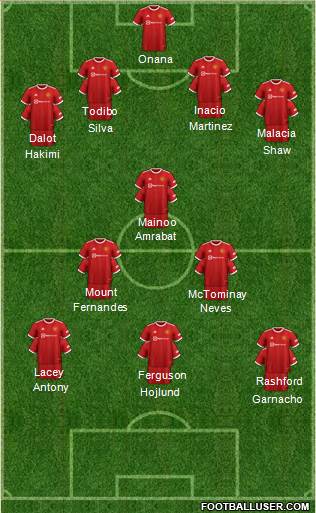 André Onana (Altay Bayindir) · Lisandro Martínez (Luke Shaw) · Leny Yoro (Victor Lindelöf) · Matthijs de Ligt (Casemiro) · Marcus Rashford (Alejandro Garnacho) · Antony (Amad Diallo) · Rasmus Højlund (Joshua Zirkzee) · Diogo Dalot (Noussair Mazraoui) · Bruno Fernandes (Christian Eriksen) · Manuel Ugarte (Kobbie Mainoo), ...