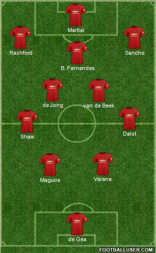 Højlund · B. Fernandes · Garnacho · Eriksen · Mount · Casemiro · Shaw · Dalot · L. Martínez · Varane · Onana
