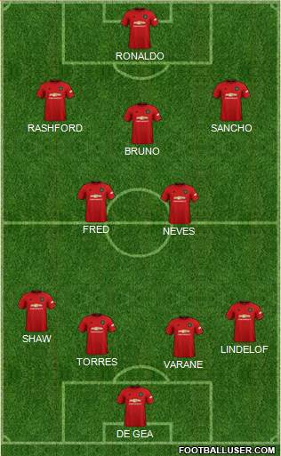 D.T: Alex Ferguson · # Wayne Rooney · # Cristiano Ronaldo · # Dimitar Berbatov · # Park Ji-Sung · # Carlos A. Tevez · # Paul Scholes · # Ryan Giggs (c) · # Anderson de Oliveira · # Michael Carrick · # John O'Shea · # Patrice Evra · # Rio Ferdinand · # Nemanja Vidic · # Edwin van der Sar