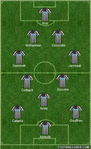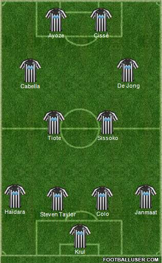 01 - Tim Krul . · 04 - Coloccini . · 03 - Sakta . · 44 - Williamson . · 02 - Taylor . · 05 - Santon . · 07 - Tioté . · 08 - Jonas . · 10 - De Jong . · 11 - Ayoze ( C ) . · 09 - Riviére .