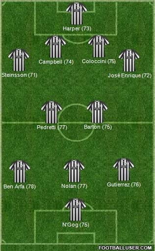 1. M.Almunia [76] · 21. S.Diawara [83] · 2. F.Coloccini [75] · 16. R.Taylor [74] · 3. D.Santon [77] · 24. C.Tiote [77] · 4. Y.Cabaye [78] · 18. J.Gutierrez [80] · 19. D.Ba [78] · 10. H.Ben Arfa [77] · 23. S.Ameobi [74]