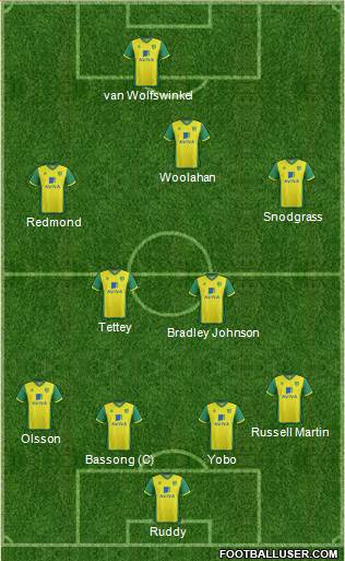 Ruddy · Bassong · Yobo · Olsson · Martin · Tettey · Johnson · Snodgrass · Hoolahan · Jonás Gutiérrez · Hooper