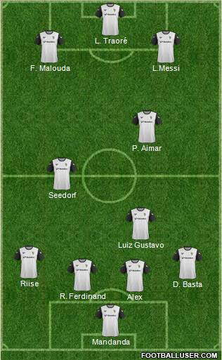Mandanda · R. Ferdinand · Alex · D. Basta · Riise · J.Mikel · Luiz Gustavo · Seedorf · P. Aimar · L.Messi · L. Traoré
