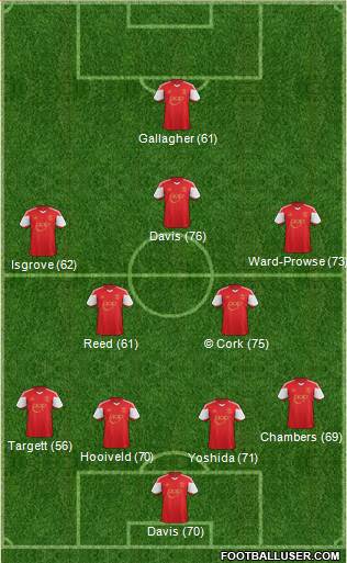 25. Davis (68) · 15. Hutchinson (75) · 3. Yoshida (74) · 21. Sheehan (66) · 22. Chambers (73) · 18. Cork (78) · 16. Ward-Prowse (74) · 19. Hall (68) · © 8. Davis (76) · 14. Gauld (67) · 7. Lambert (75)