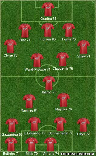 Boruc [75] · Yoshida [73] · Forren [76] · Shaw [70] · Clyne [76] · Cork [74] · Schneiderlin [77] · Lallana [78] · Ramirez [80] · Puncheon [73] · Rodriguez [75]